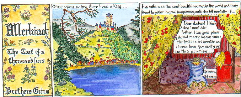 WELCOME TO ALLERLEIRAUH, an eight episode cartoon drawn by Bethan. It is based on a traditional German (Brothers' Grimm) fairy story and drawn in black pen and then painted over with water colour. This first episode was put on in June - I hope you enjoy reading it!
