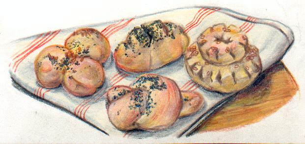 Method: 1. Sift the flour and salt into a large bowl. Stir in the sugar and yeast. 2. Rub in the butter or margarine then add the warmed water and mix to a dough. 3.Knead for ten minutes. Place in a lightly oiled bowl and cover with a tea towel. Leave to rise in a warm place for about an hour. 4.Knock back the dough and divide into 12 equal pieces. Shape into rolls and place on 2 greased baking sheets. Leave in a warm place for half an hour. Meanwhile pre-heat the oven to gas mark 7 (220°C/ 425°F). Sprinkle the buns with the seeds and bake for 15 - 20 minutes. Transfer to a wire rack to cool. |