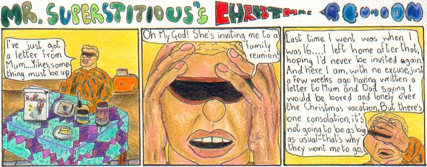 Welcome to Mr. Superstitious's Christmas Reunion, a new Mr Superstitious cartoon especially drawn for Christmas and published exclusively on the Jamboree. Mr Superstitious is created, written and illustrated by Samuel, and is drawn using black pen and coloured crayons.