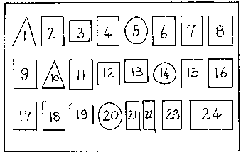 Take the coloured sheet of paper and using a coloured crayon of your choice, draw 24 squares, oblongs or circles, or a mixture of all these. Take care to leave a border of 2 cm (¾