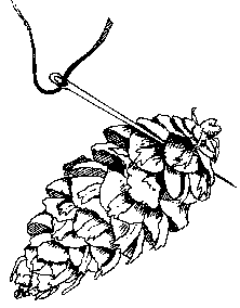 Thread the needle with the string and push it through the top of the first fir cone. (Diagram 1.) When the fir cone is big, this can be quite hard – it is best to work on an old bread board or piece of wood and to wear gloves so as not to hurt your fingers.