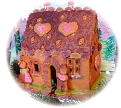 Note 1: Any left-over gingerbread dough can be made into people, hearts, or other shapes, which can be stuck to the house with icing later. The house can be decorated before baking with little pieces of dough, which stick on during cooking. The ‘curved stones’ on the picture were done this way. |