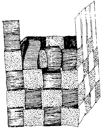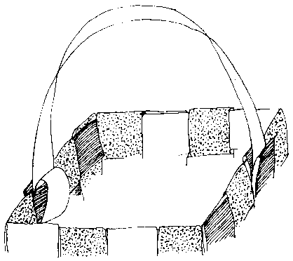 7. A handle can now be added. Cut another long strip, 32 cm by 2 cm (12½" by 4/5"), and insert one end into the second square on one side of the basket and the other end into the third square on the opposite side of the basket. Fold round the ends until the handle is secure. |