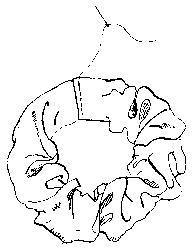 5. Once the tube has been turned inside out, sew one end of the elastic firmly to the inside of the tube as shown in diagram 2, then scrunch up the cloth until the elastic shows through the other end. Sew it firmly into place.